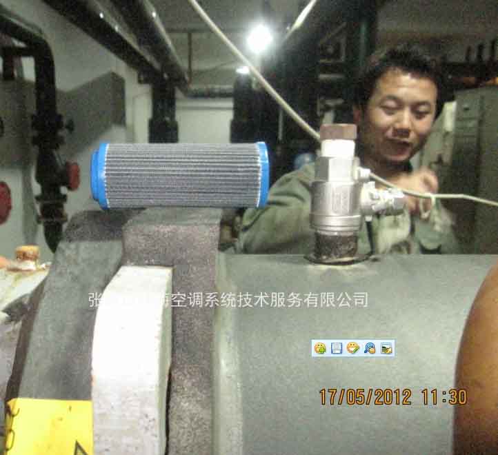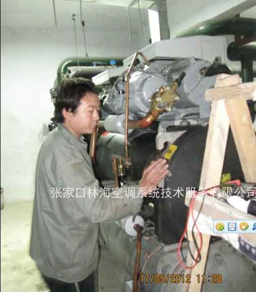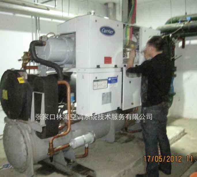 开利主机整体清洁。工程师吴晓龙在进行最后的清洁及检测,准备开机工作。